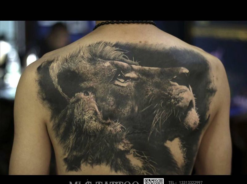 遮盖后背写实狮子作品欣赏纹身图片