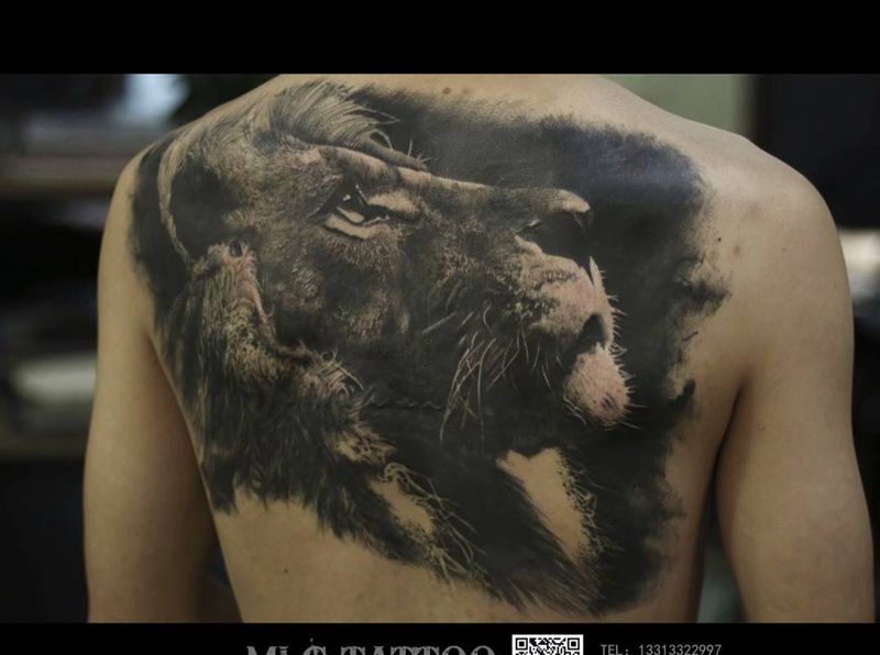 遮盖后背写实狮子作品欣赏纹身图片