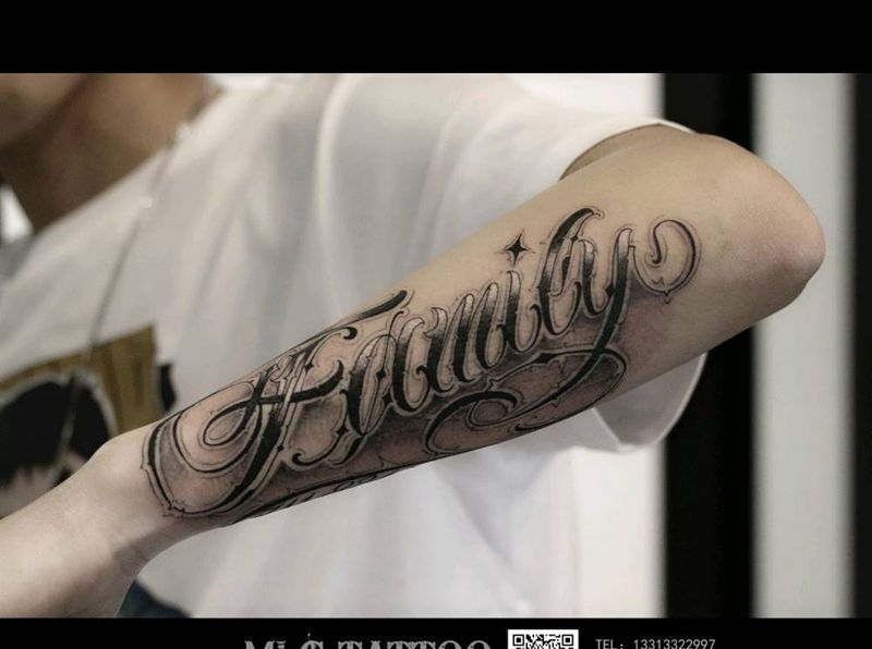 当前位置: 首页 >河北省保定市纹身店-魔罗阁刺青潮店纹身图案>家庭---花体字纹身图片_手臂花体字纹身图案