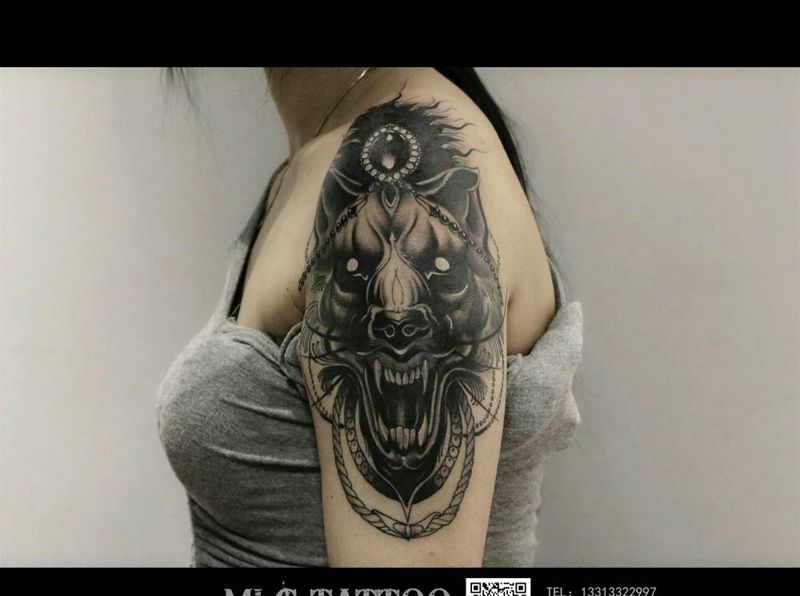 当前位置: 首页 >河北省保定市纹身店-魔罗阁刺青潮店纹身图案>狼头纹身图片_手臂New School纹身图案