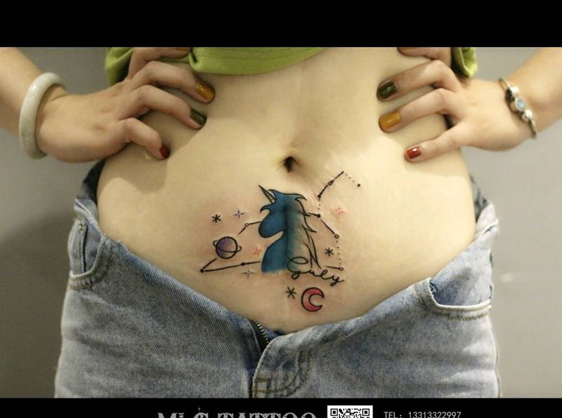 刨腹产遮盖作品纹身图片_腹部水彩纹身图案