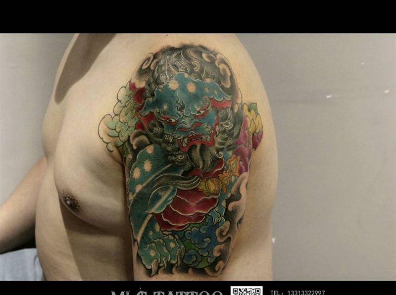 当前位置: 首页 >河北省保定市纹身店-魔罗阁刺青潮店纹身图案>唐狮纹身图片_肩部老传统新传统纹身图案