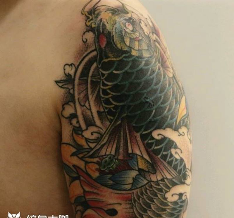 遮盖作品 锦鲤纹身图片_肩部新传统老传统纹身图案