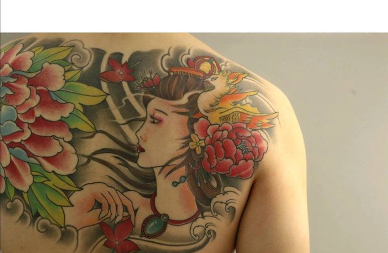 传统艺伎牡丹纹身图片_背部新传统老传统纹身图案