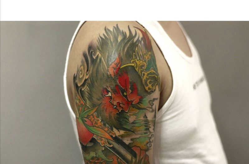 当前位置: 首页 >河北省保定市纹身店-魔罗阁刺青潮店纹身图案>传统风格推荐-美猴王纹身图片_手臂老传统新传统纹身图案
