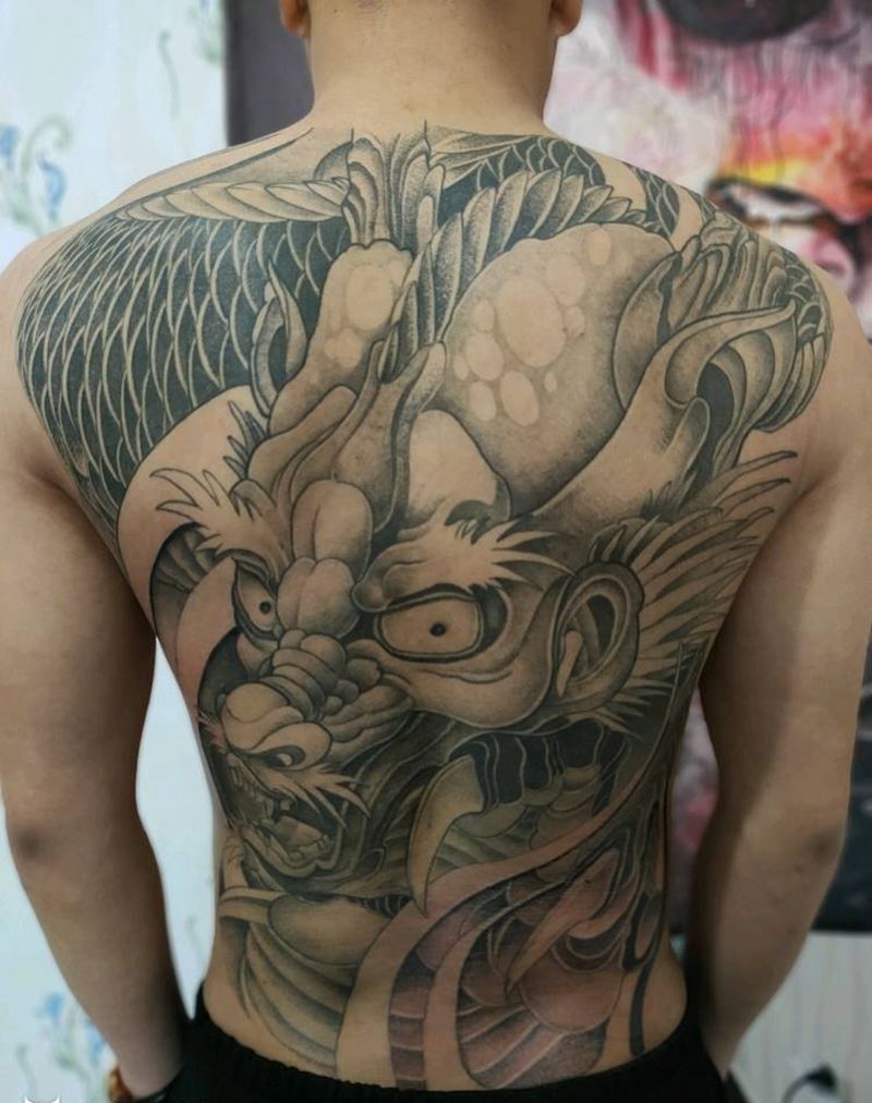 满背龙纹身图片_背部点刺纹身图案