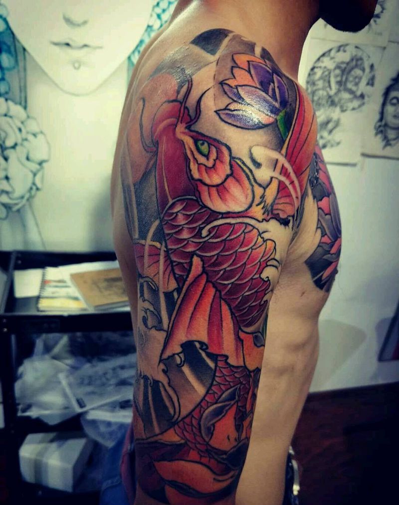 当前位置: 首页 >河北省保定市纹身店-安·刺青纹身图案>锦鲤莲花半甲纹身图片