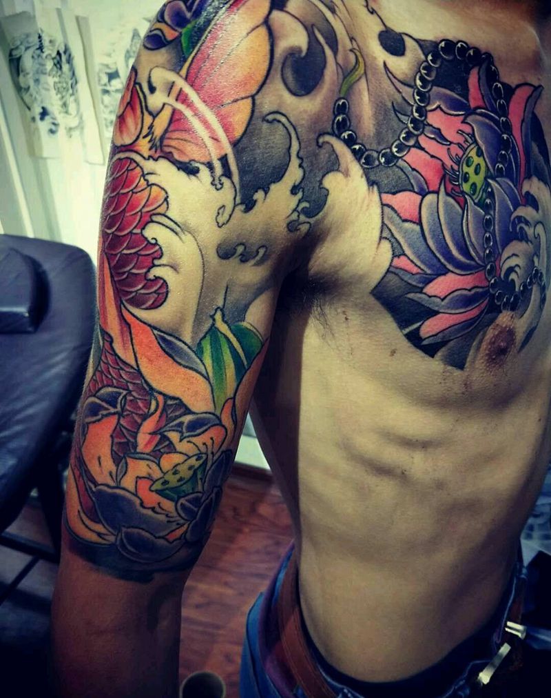 当前位置: 首页 >河北省保定市纹身店-安·刺青纹身图案>锦鲤莲花半甲纹身图片