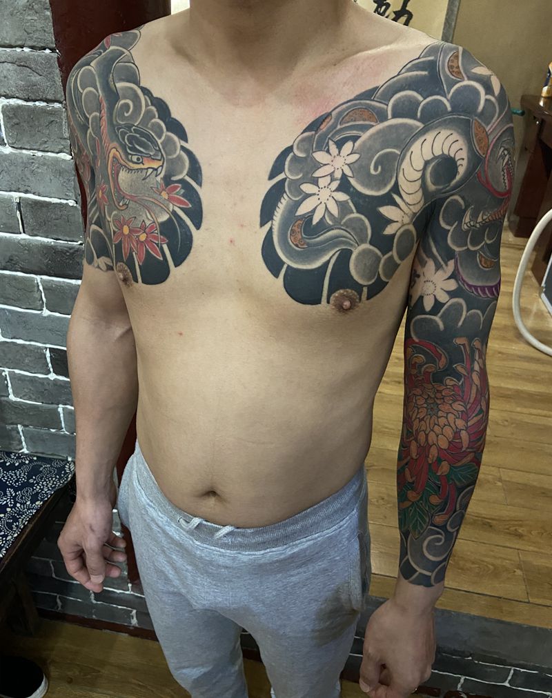 当前位置: 首页 >河北省邢台市纹身店-小黑刺青纹身专营店纹身图案>日式传统花臂➕半胛纹身图片_手臂胸部老传统纹身图案