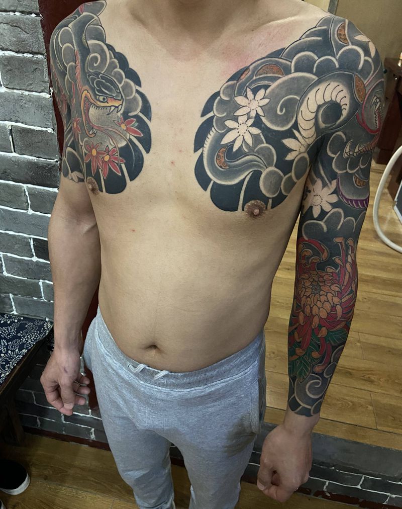 当前位置: 首页 >河北省邢台市纹身店-小黑刺青纹身专营店纹身图案>日式传统花臂➕半胛纹身图片_手臂胸部老传统纹身图案