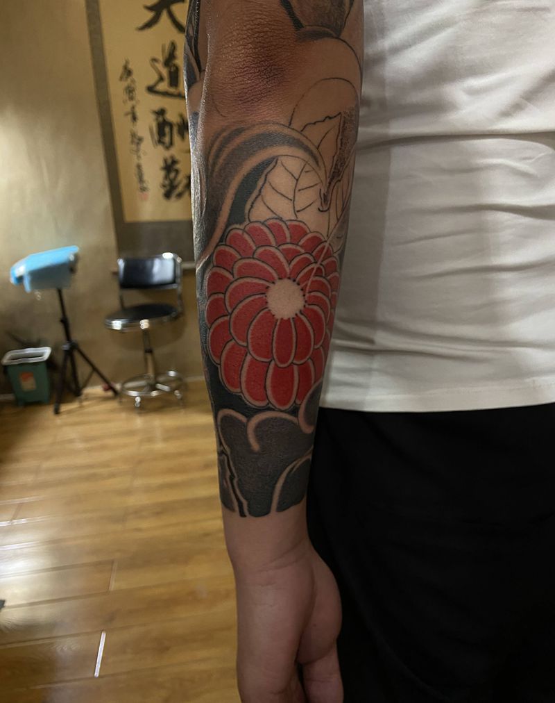 当前位置: 首页 >河北省邢台市纹身店-小黑刺青纹身专营店纹身图案>日式菊花纹身图片_手臂老传统纹身图案