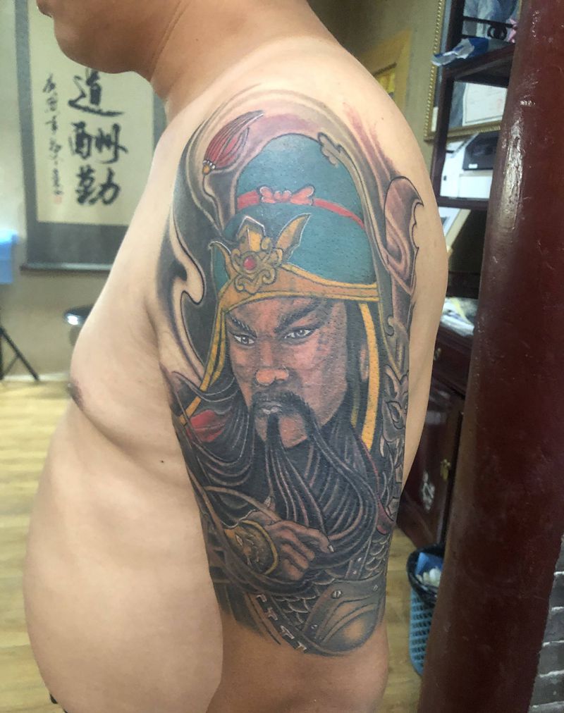 当前位置: 首页 >河北省邢台市纹身店-小黑刺青纹身专营店纹身图案>关二爷覆盖纹身图片_手臂新传统纹身图案