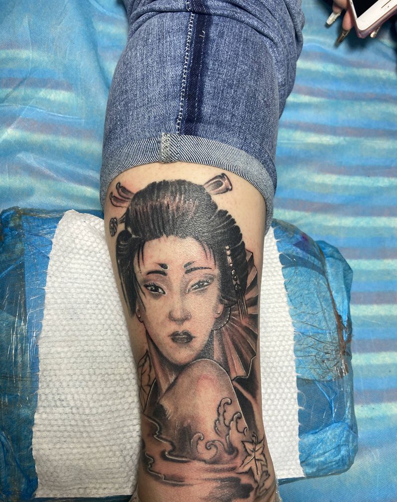 当前位置: 首页 >河北省邢台市纹身店-小黑刺青纹身专营店纹身图案>艺妓纹身图片_腿部纹身图案