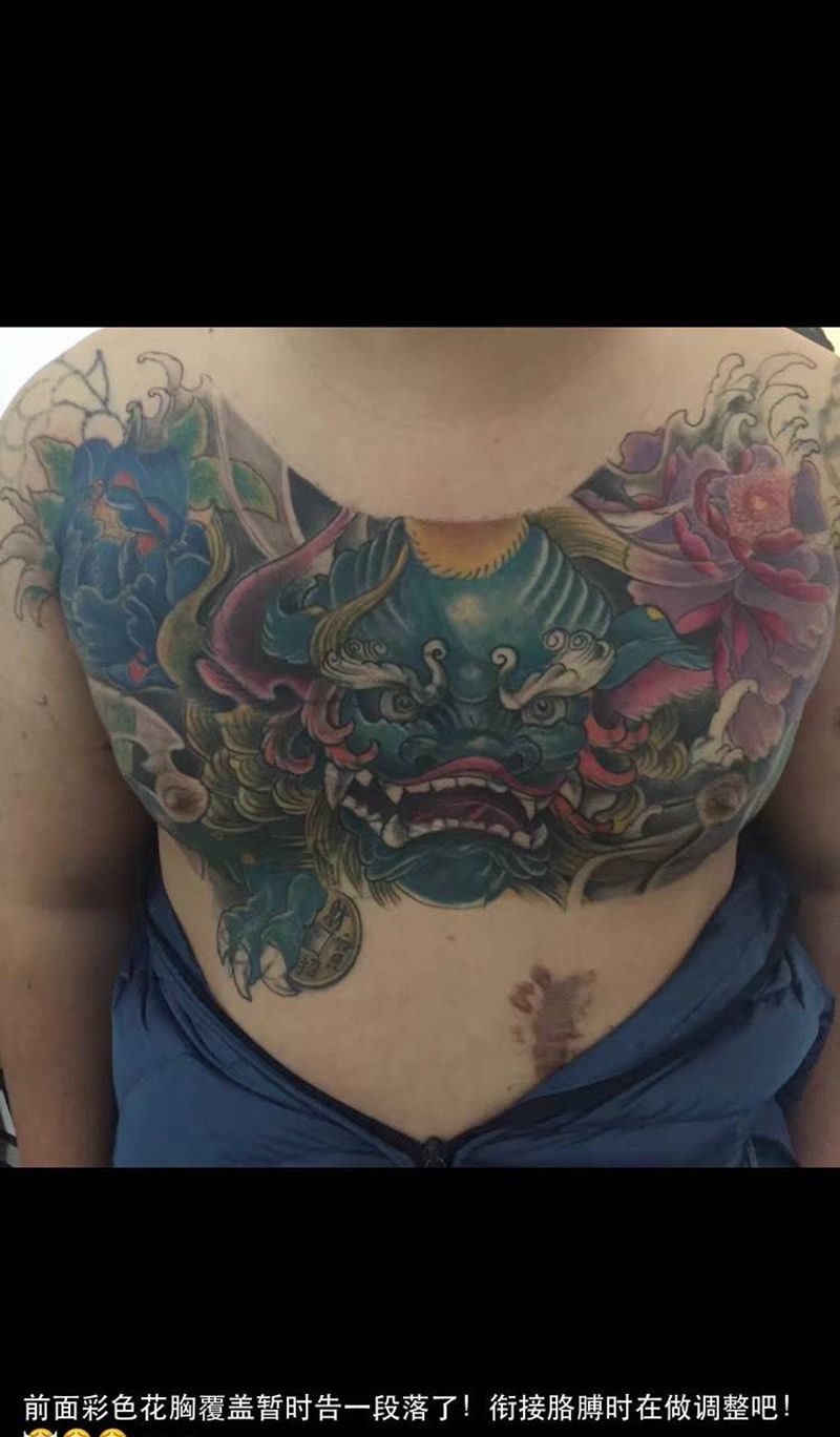 当前位置: 首页 >河北省邢台市纹身店-小黑刺青纹身专营店纹身图案>覆盖抗肩龙彩色唐狮子纹身图片