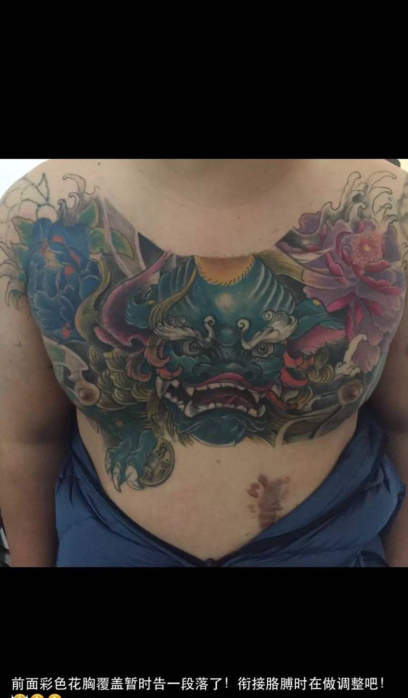 当前位置: 首页 >河北省邢台市纹身店-小黑刺青纹身专营店纹身图案>覆盖抗肩龙彩色唐狮子纹身图片