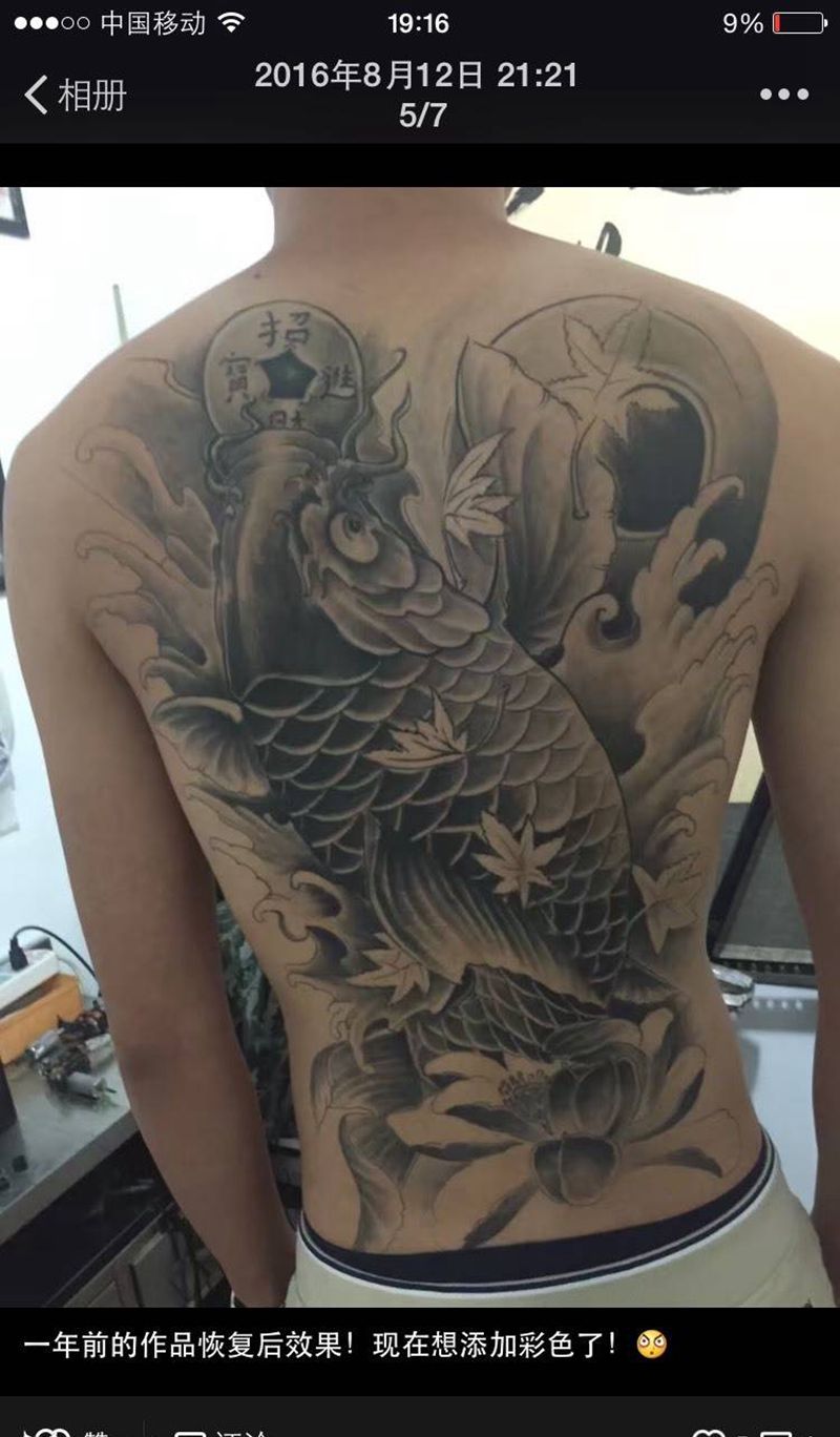 当前位置: 首页 >河北省邢台市纹身店-小黑刺青纹身专营店纹身图案>后背锦鲤纹身图片