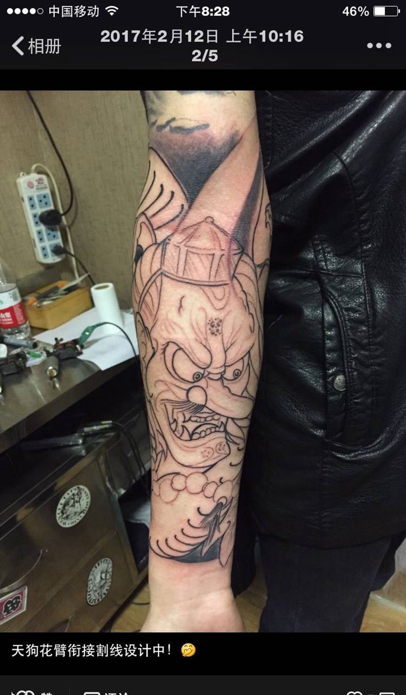 当前位置: 首页 >河北省邢台市纹身店-小黑刺青纹身专营店纹身图案>天狗花臂割线中!纹身图片