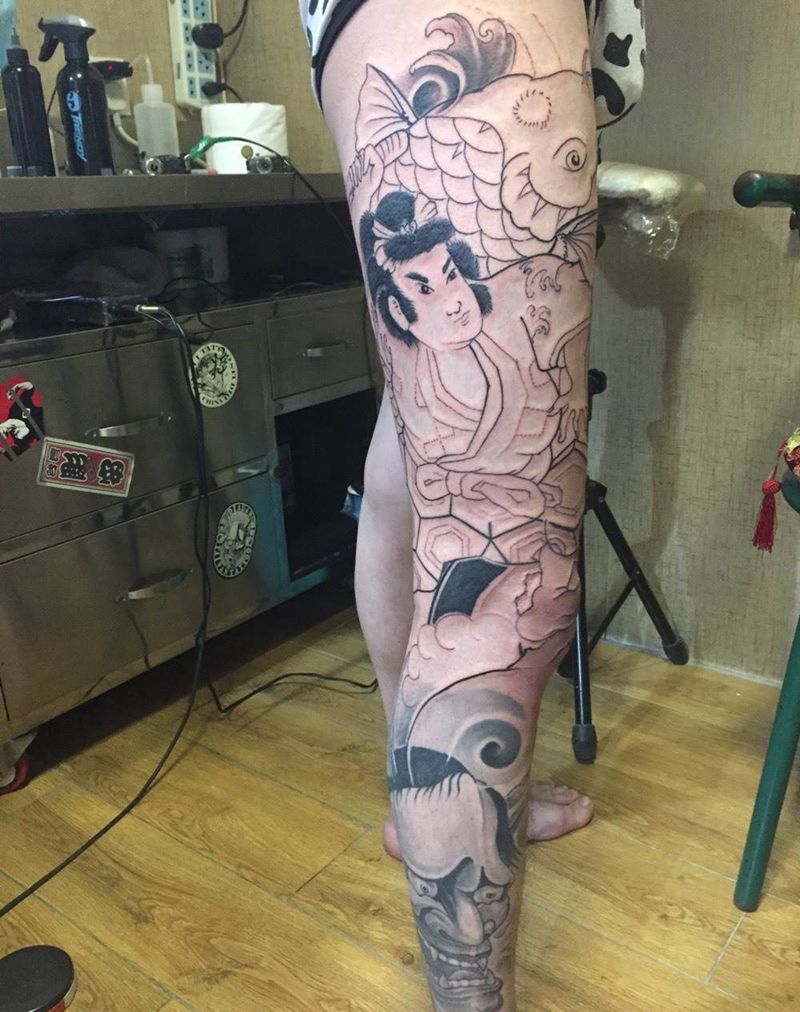 • T网红王老大花腿龙纹身图片_腿部新传统纹身图案