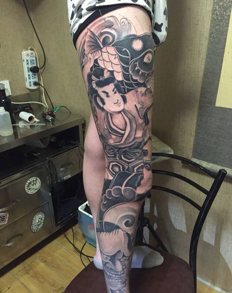 当前位置: 首页 >河北省邢台市纹身店-小黑刺青纹身专营店纹身图案>鬼若丸花腿继续扎!纹身图片