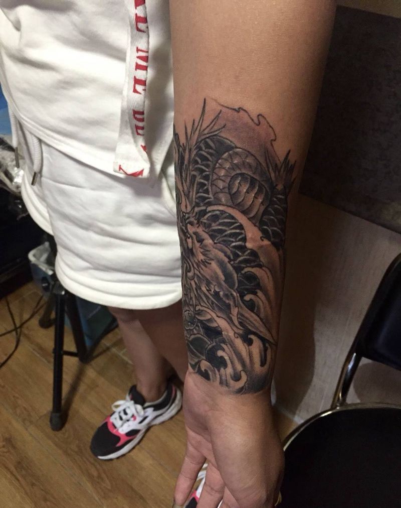 • T网红王老大花腿龙纹身图片_腿部新传统纹身图案