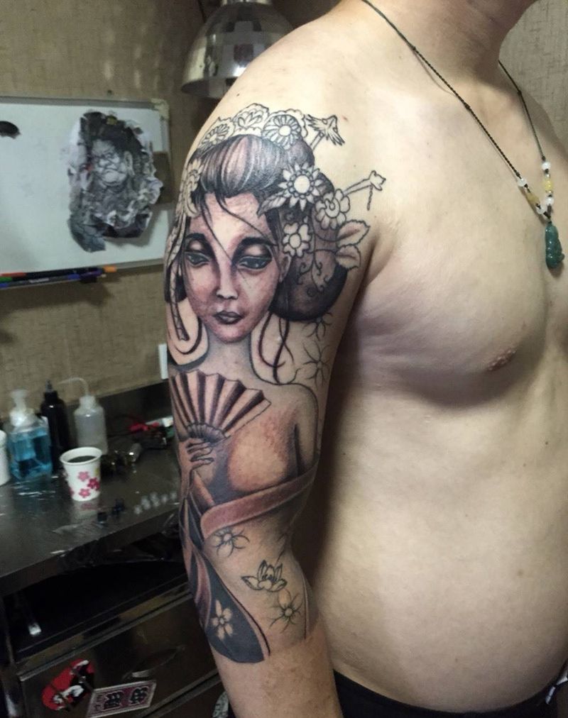 当前位置: 首页 >河北省邢台市纹身店-小黑刺青纹身专营店纹身图案>艺妓七分袖彩色纹身图片