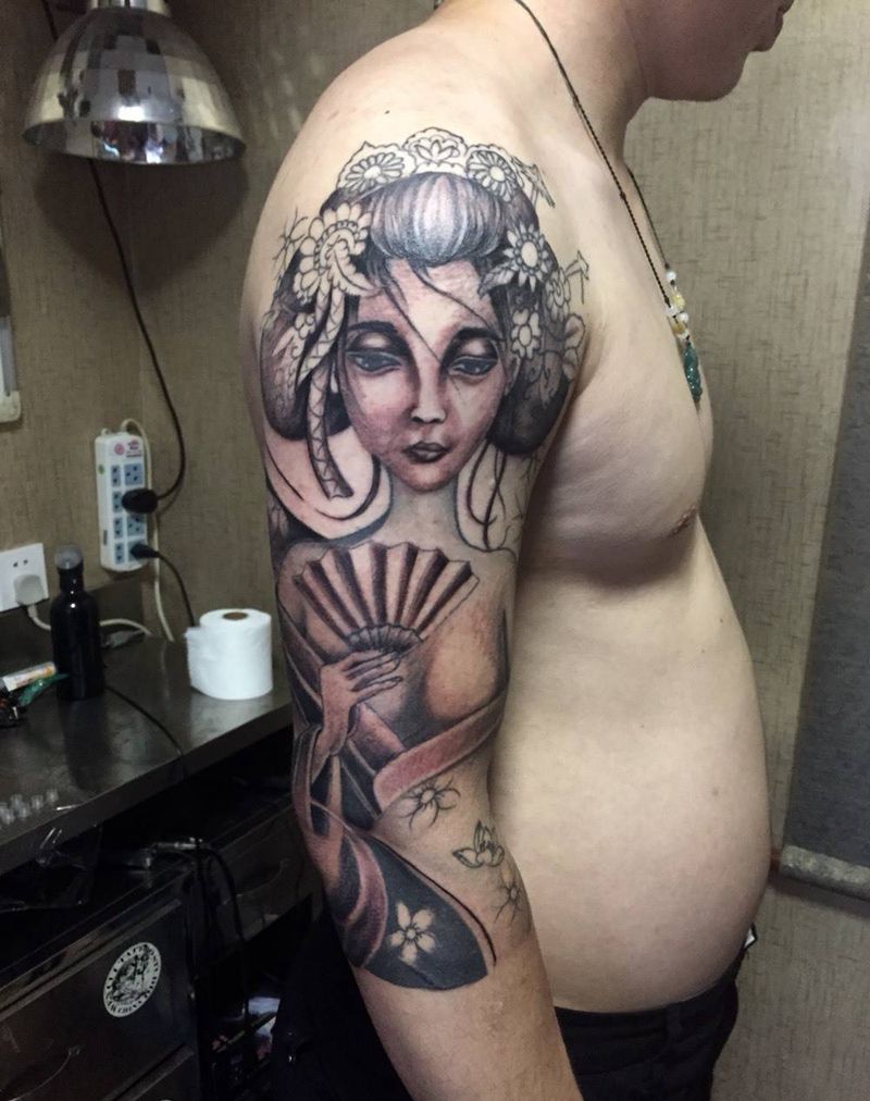 当前位置: 首页 >河北省邢台市纹身店-小黑刺青纹身专营店纹身图案>艺妓七分袖彩色纹身图片