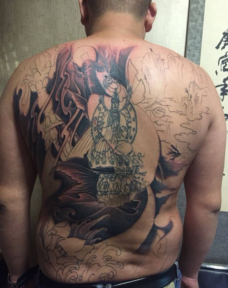 后背覆盖山水纹身图片