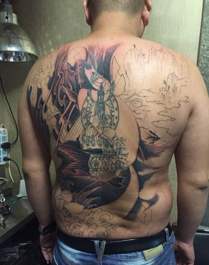后背覆盖山水纹身图片