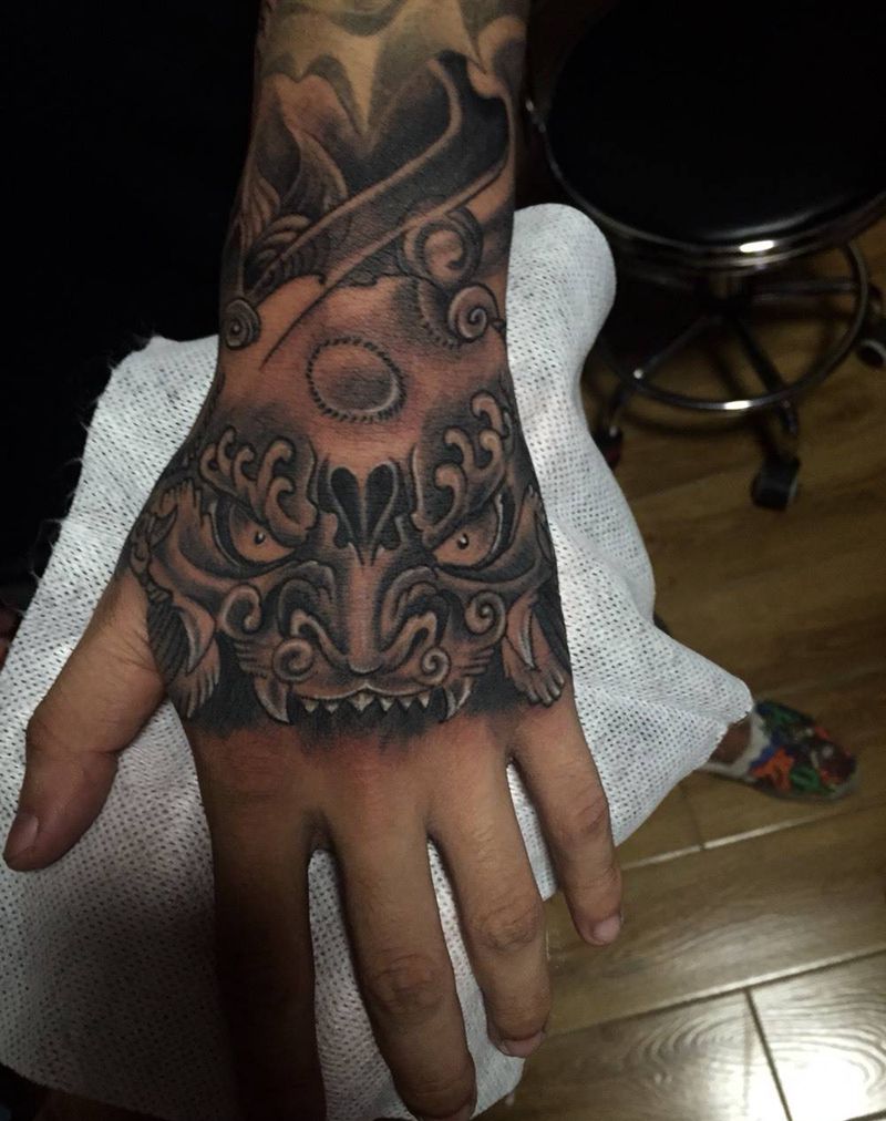 当前位置: 首页 >河北省邢台市纹身店-小黑刺青纹身专营店纹身图案>手背唐狮子!纹身图片