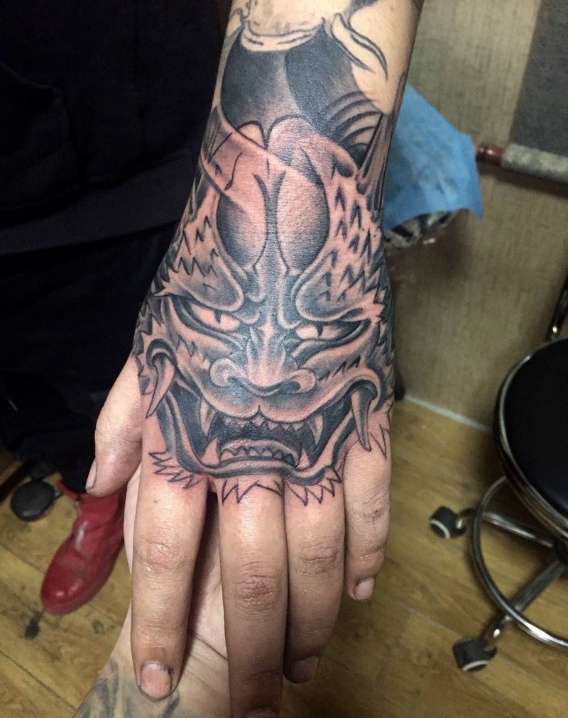 当前位置: 首页 >河北省邢台市纹身店-小黑刺青纹身专营店纹身图案>手掌鬼首!纹身图片