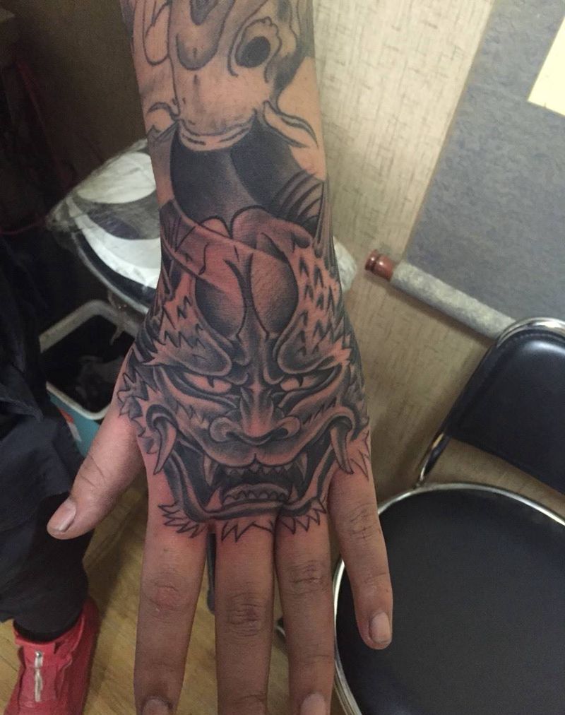 当前位置: 首页 >河北省邢台市纹身店-小黑刺青纹身专营店纹身图案>手掌鬼首!纹身图片
