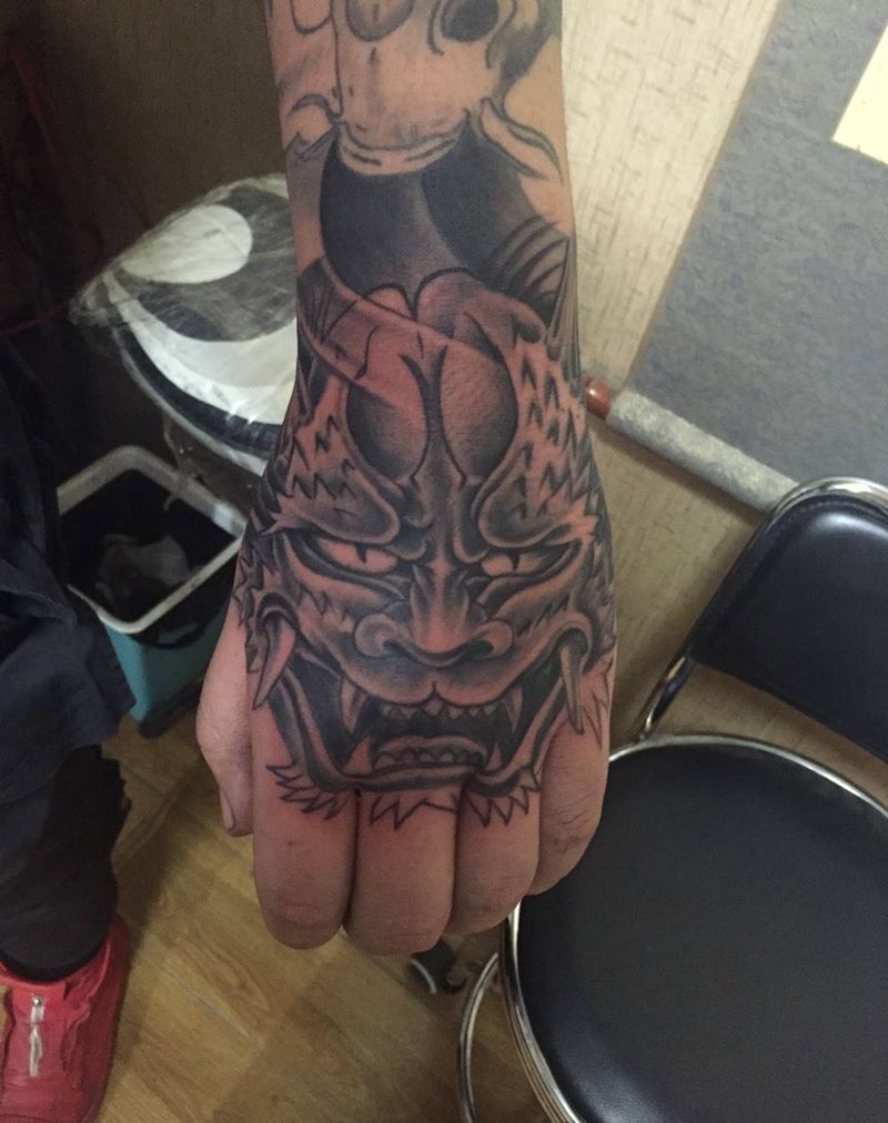 当前位置: 首页 >河北省邢台市纹身店-小黑刺青纹身专营店纹身图案>手掌鬼首!纹身图片