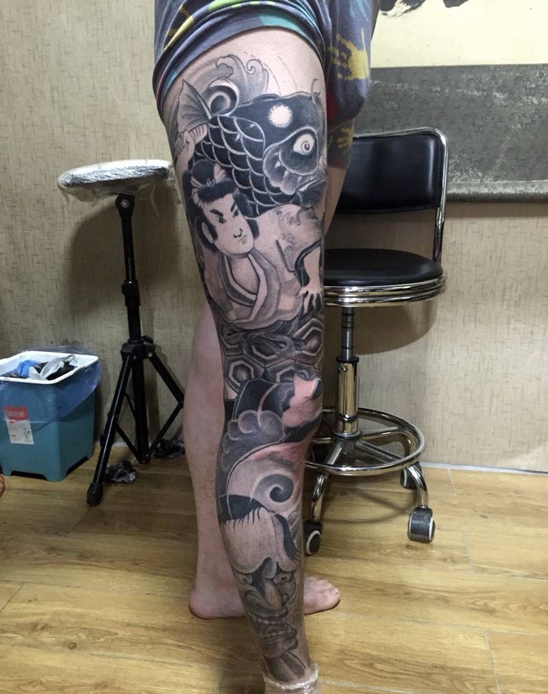 鬼若玩花腿未完成纹身图片