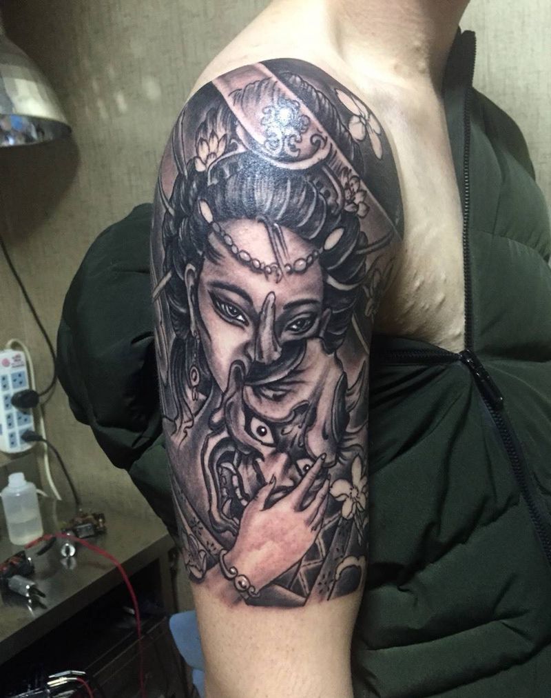 当前位置: 首页 >河北省邢台市纹身店-小黑刺青纹身专营店纹身图案>艺妓大臂!纹身图片