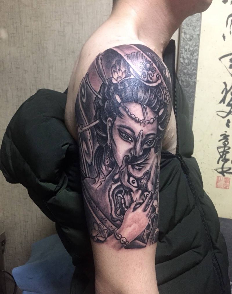 当前位置: 首页 >河北省邢台市纹身店-小黑刺青纹身专营店纹身图案>艺妓大臂!纹身图片