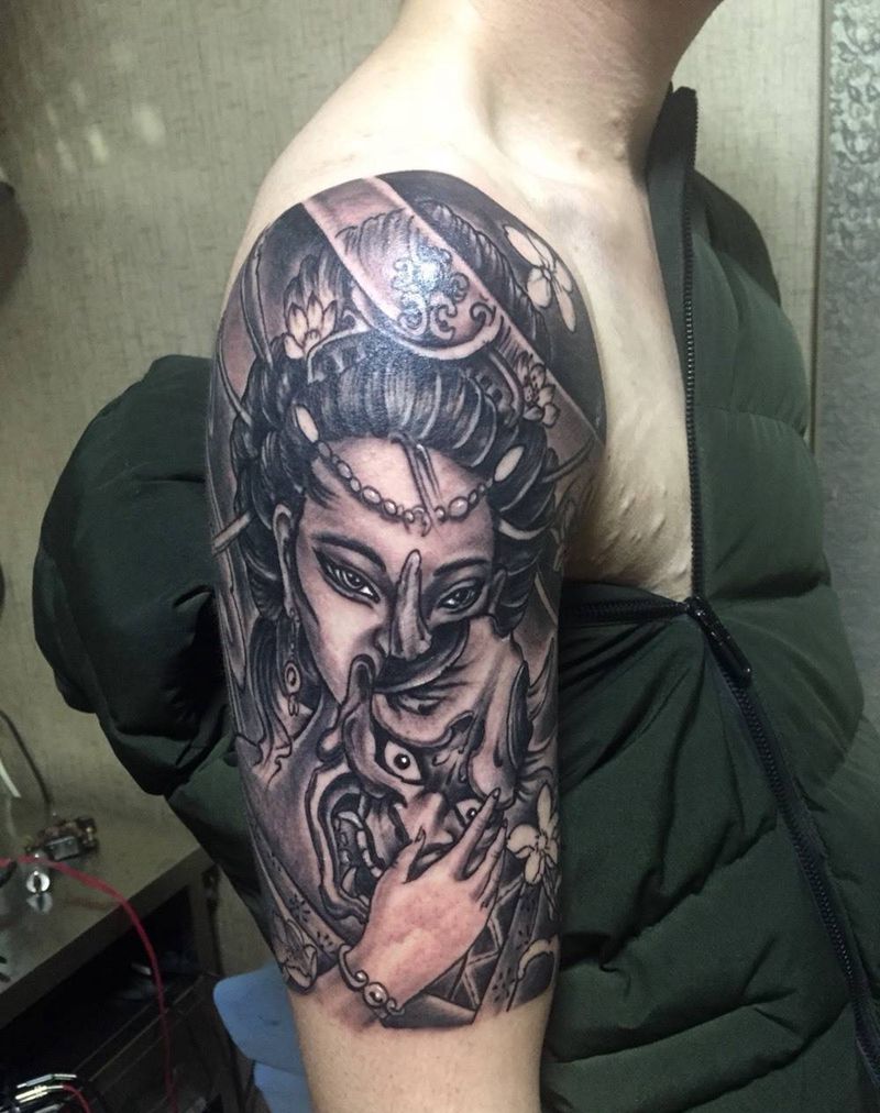 当前位置: 首页 >河北省邢台市纹身店-小黑刺青纹身专营店纹身图案>艺妓大臂!纹身图片