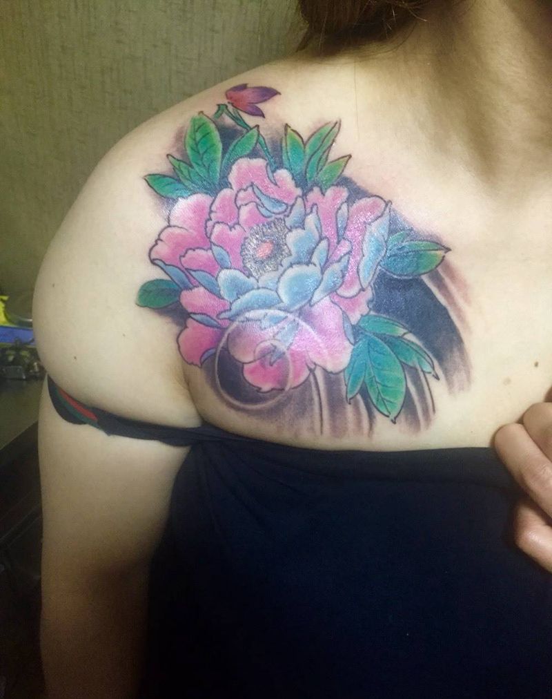 当前位置: 首页 >河北省邢台市纹身店-小黑刺青纹身专营店纹身图案>覆盖彩色牡丹纹身图片