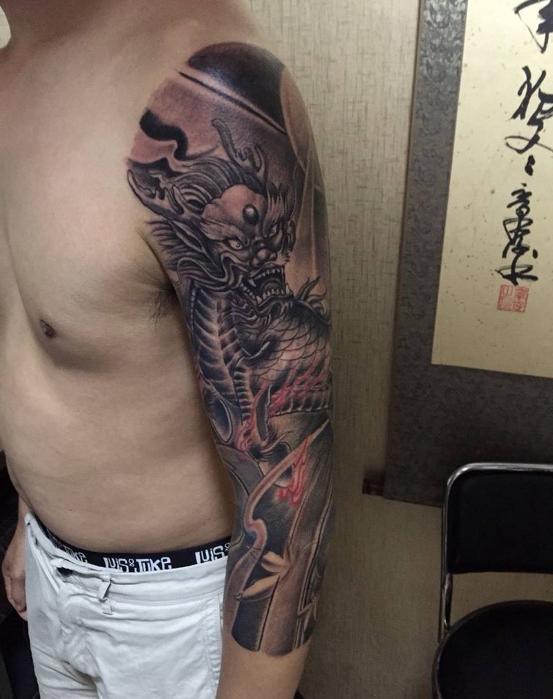 当前位置: 首页 >河北省邢台市纹身店-小黑刺青纹身专营店纹身图案>火麒麟七分袖花臂纹身图片