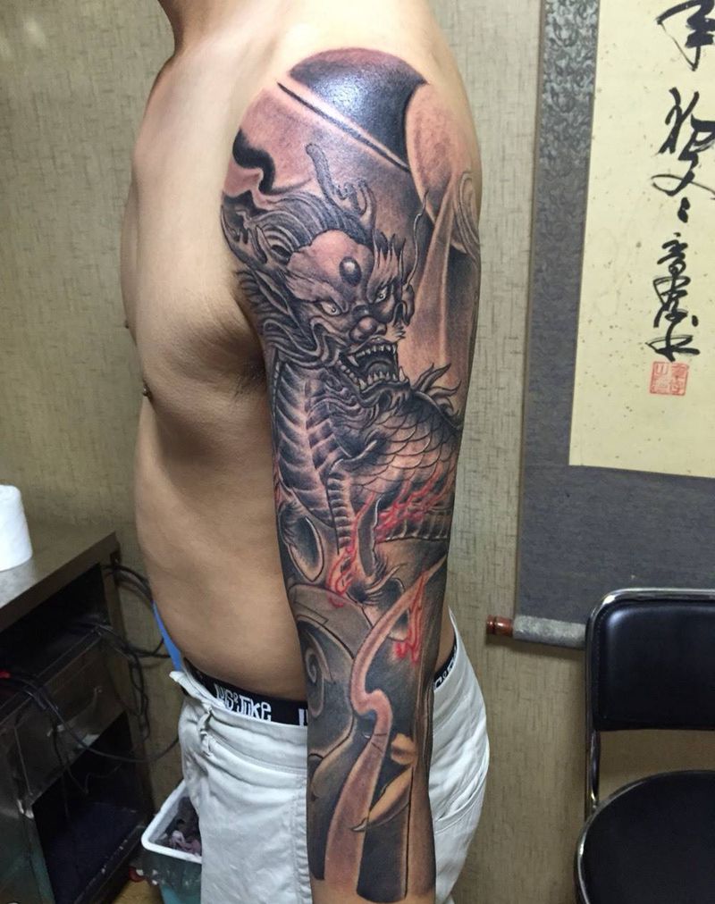 当前位置: 首页 >河北省邢台市纹身店-小黑刺青纹身专营店纹身图案>火麒麟七分袖花臂纹身图片