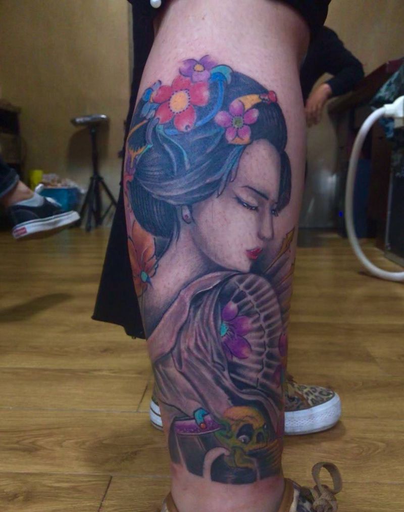 当前位置: 首页 >河北省邢台市纹身店-小黑刺青纹身专营店纹身图案>艺妓彩色纹身图片
