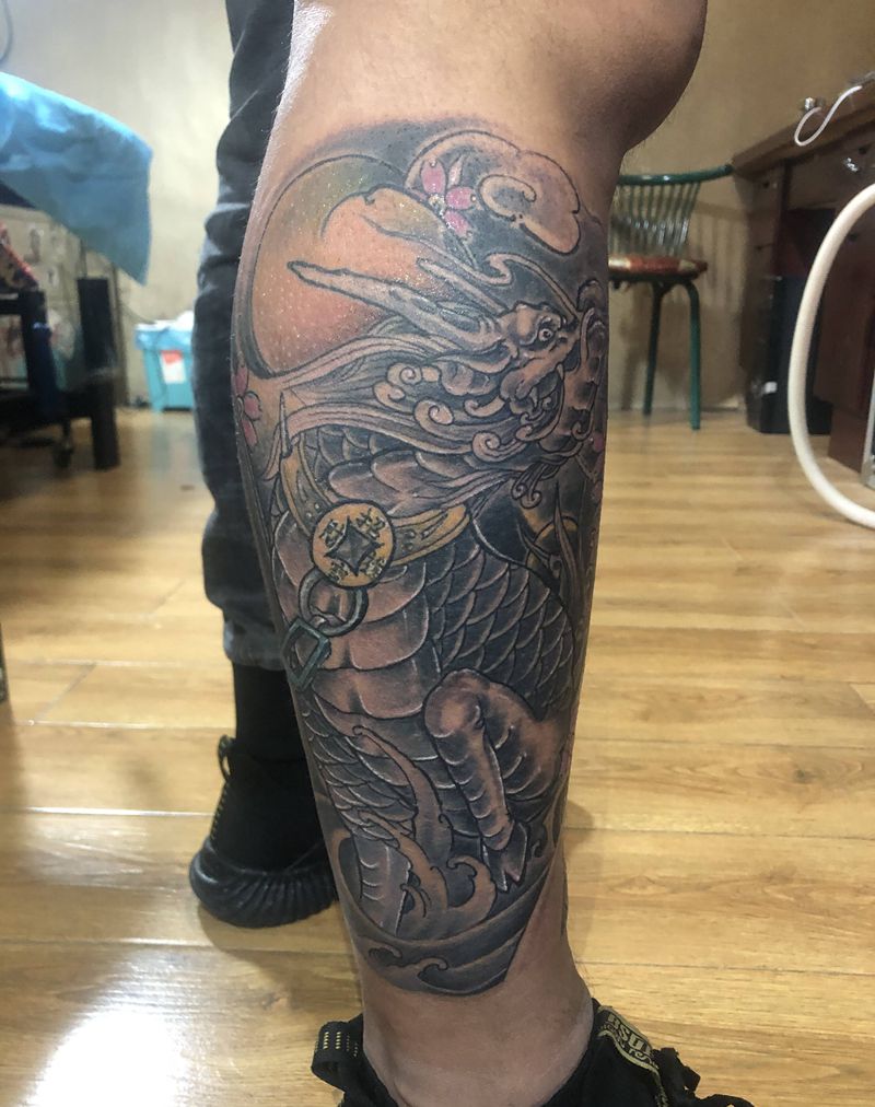 • T网红王老大花腿龙纹身图片_腿部新传统纹身图案