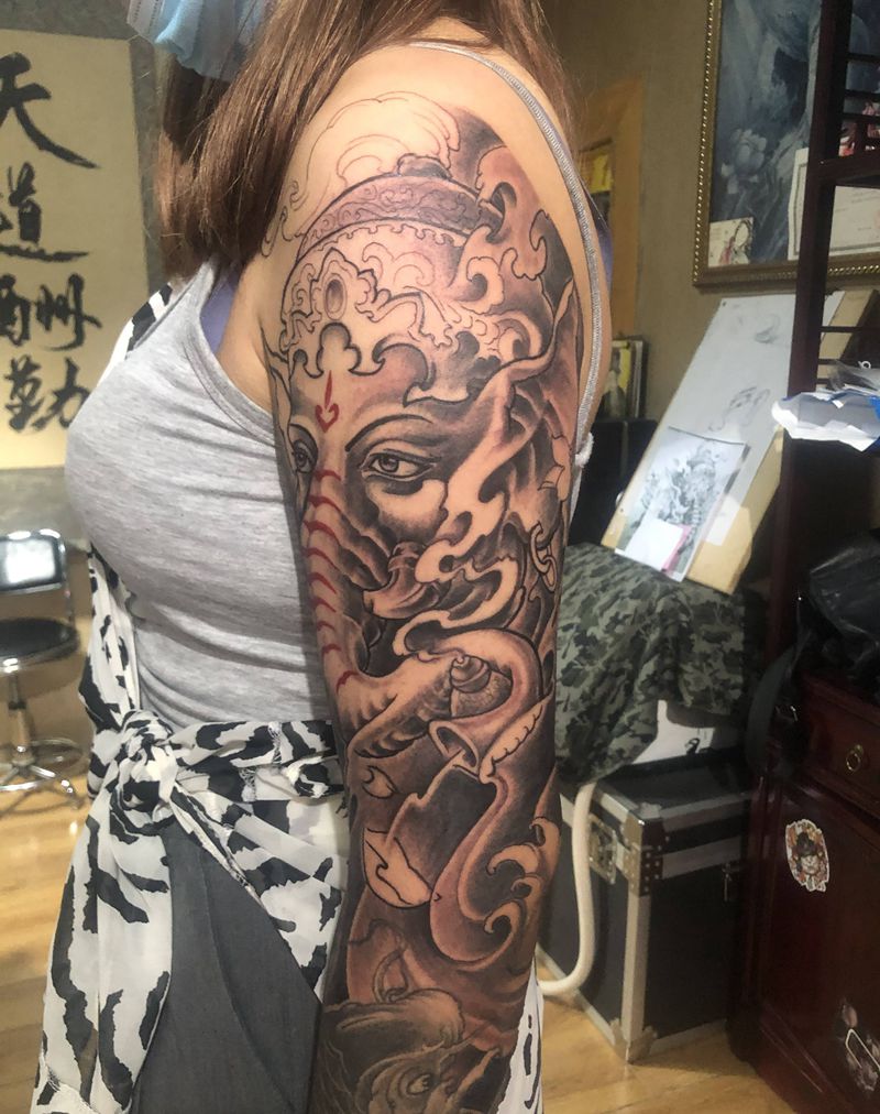 当前位置: 首页 >河北省邢台市纹身店-小黑刺青纹身专营店纹身图案>象神花臂纹身图片_手臂纹身图案
