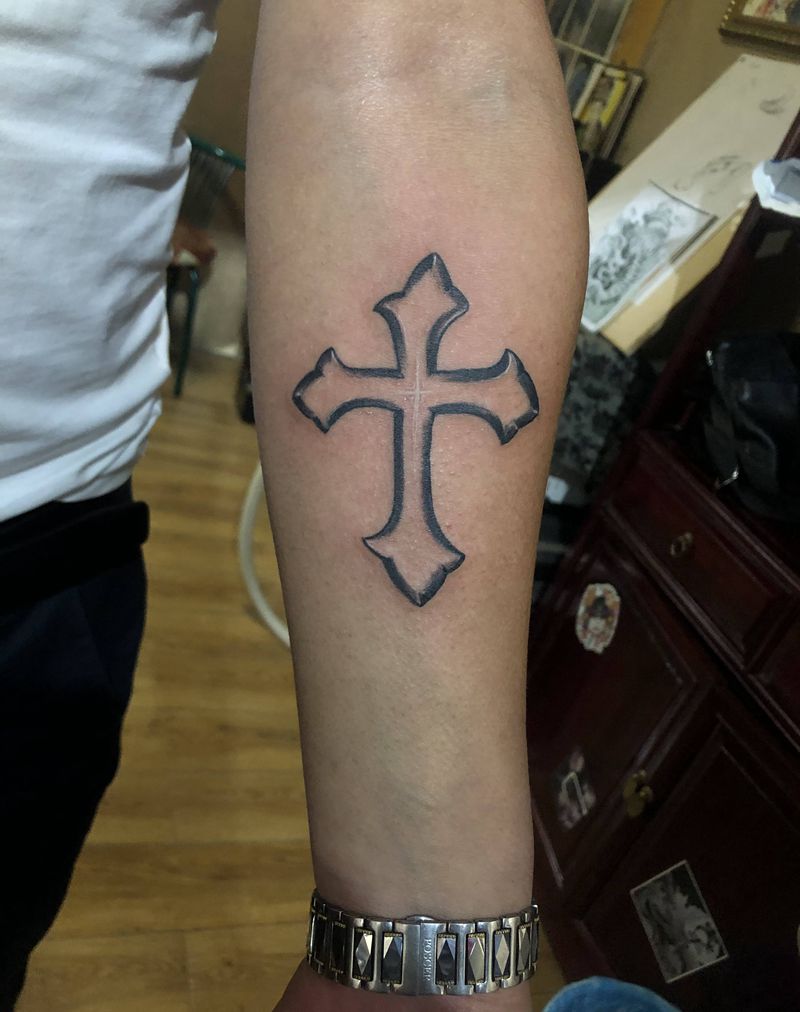 当前位置: 首页 >河北省邢台市纹身店-小黑刺青纹身专营店纹身图案>图腾十字架纹身图片_手臂图腾纹身图案
