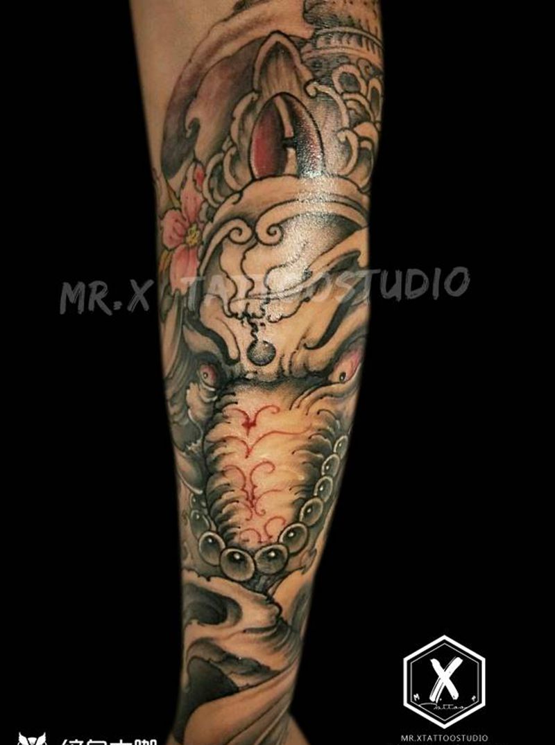 • T网红王老大花腿龙纹身图片_腿部新传统纹身图案