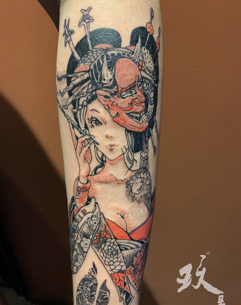 当前位置: 首页 >河北省张家口市纹身店-玖易刺青纹身图案>艺妓纹身图片_手臂新传统老传统纹身图案