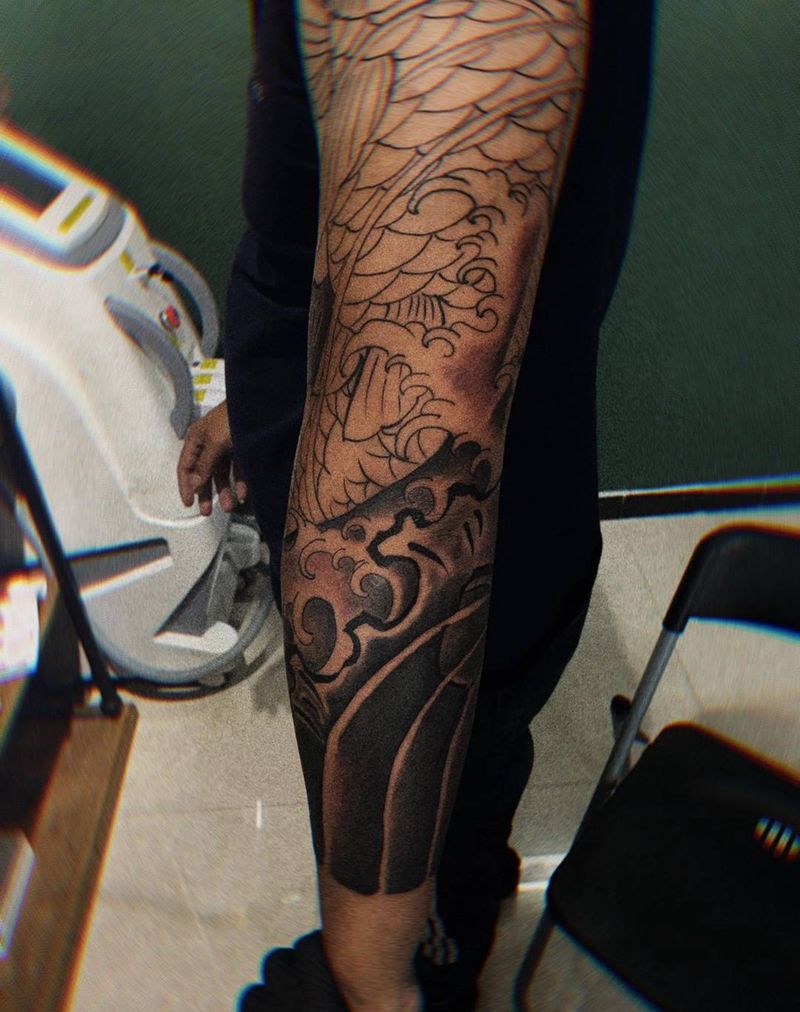 • T网红王老大花腿龙纹身图片_腿部新传统纹身图案