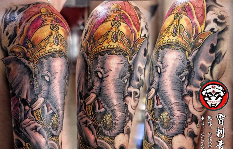 当前位置: 首页 >河北省廊坊市纹身店-霄刺青纹身图案>象神纹身图片_成品手臂传统宗教纹身图案