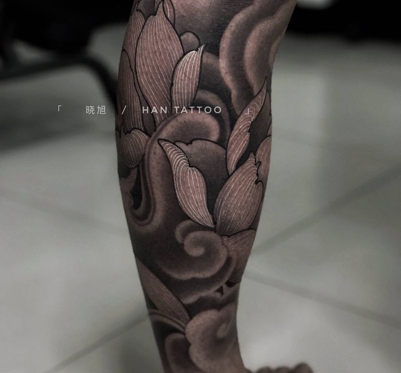 莲花(小腿黑灰)纹身图片_腿部新传统纹身图案
