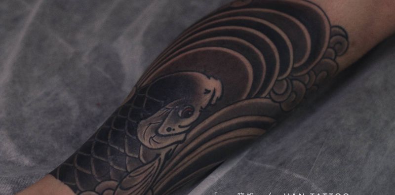 日式鱼包小腿纹身图片_腿部新传统纹身图案