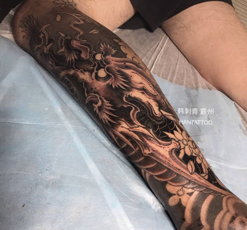 • T网红王老大花腿龙纹身图片_腿部新传统纹身图案
